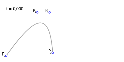 Строим линейные кривые Безье от первой точки до второй, от второй к третьей и так до последней, не соединяя линейной кривой Безье последнюю и 0-ую точку. Через точки t (полученных ранее линейных кривых) строим линейные кривые Безье начиная с нулевой и до последней, как ранее, но уже по полученным точкам, которых на одну меньше, чем ранее. Снова строим через новополученные точки t линейные кривые и из них получаем новые точки. Так повторяем пока точка не останется одна — это и есть точка кривой. Теперь представьте всё это в движении — это и есть кривая Безье. Наглядно посмотрите на анимации далее.