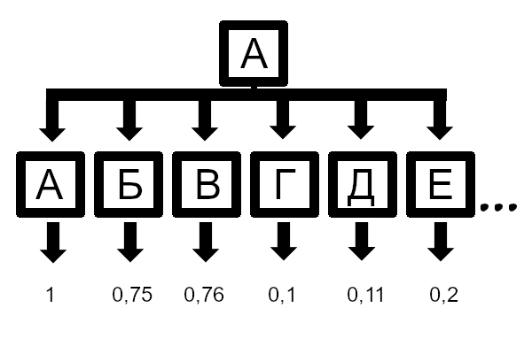 Рис 3. Схожесть экземпляра буквы "А" с эталонами. Все числа приведены для примера в концепции.